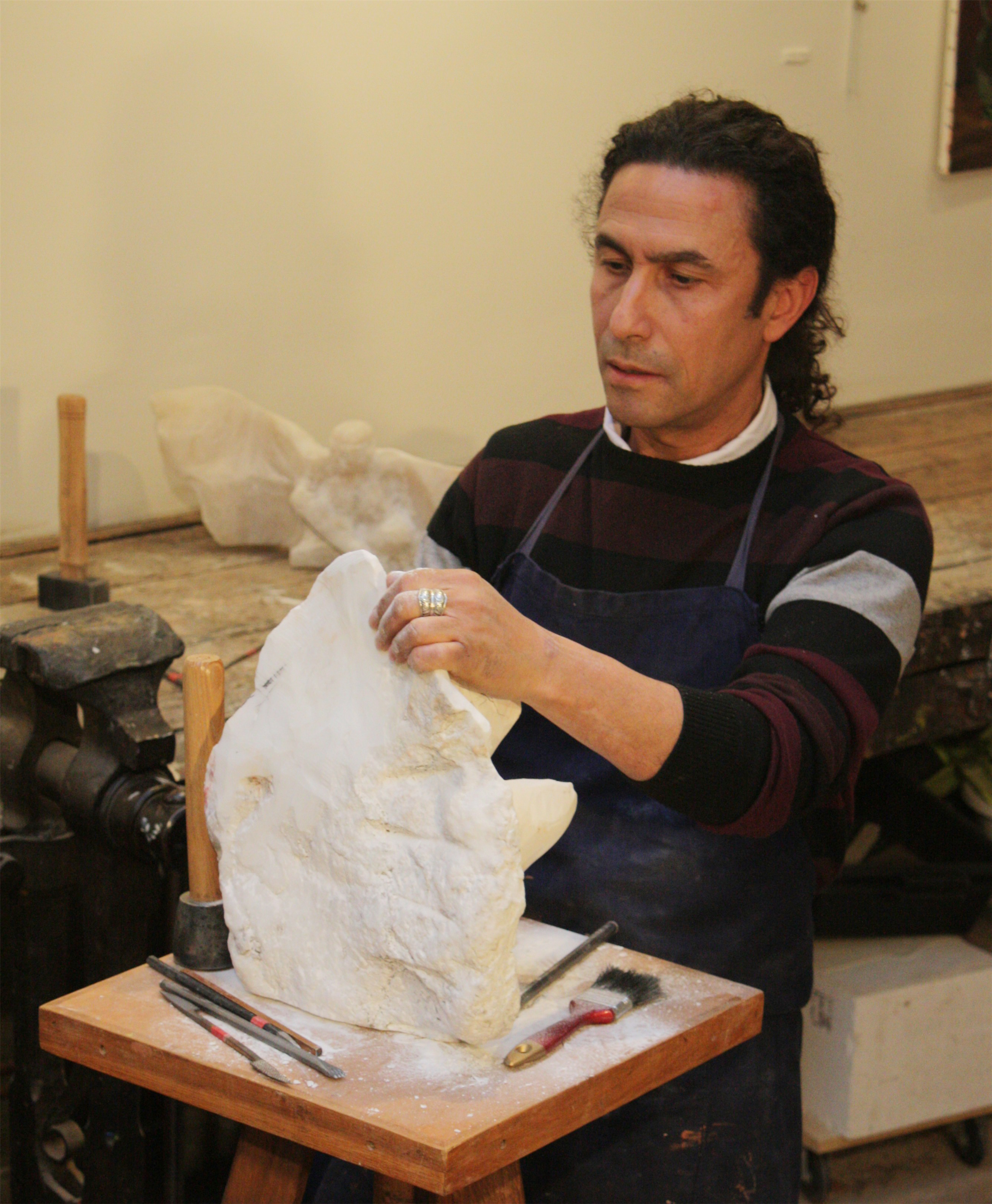 A son tour, il fricote avec le carrare et l’albâtre, s’associe aux performances des uns et des autres, enchaîne ateliers où il enseigne et ateliers où il apprend, ici ou là -bas.